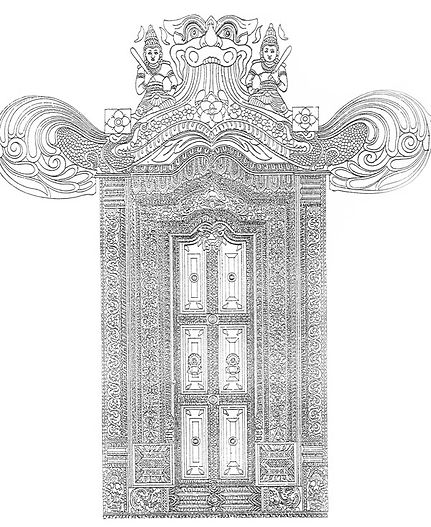 We find on the outside the same golden barrier, at the foot of a few steps under a vast awning of very advanced wood supported by decorated pillars.